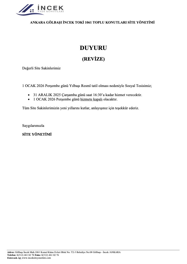 Sosyal Tesis Önemli Bilgilendirme Duyurusu Revize